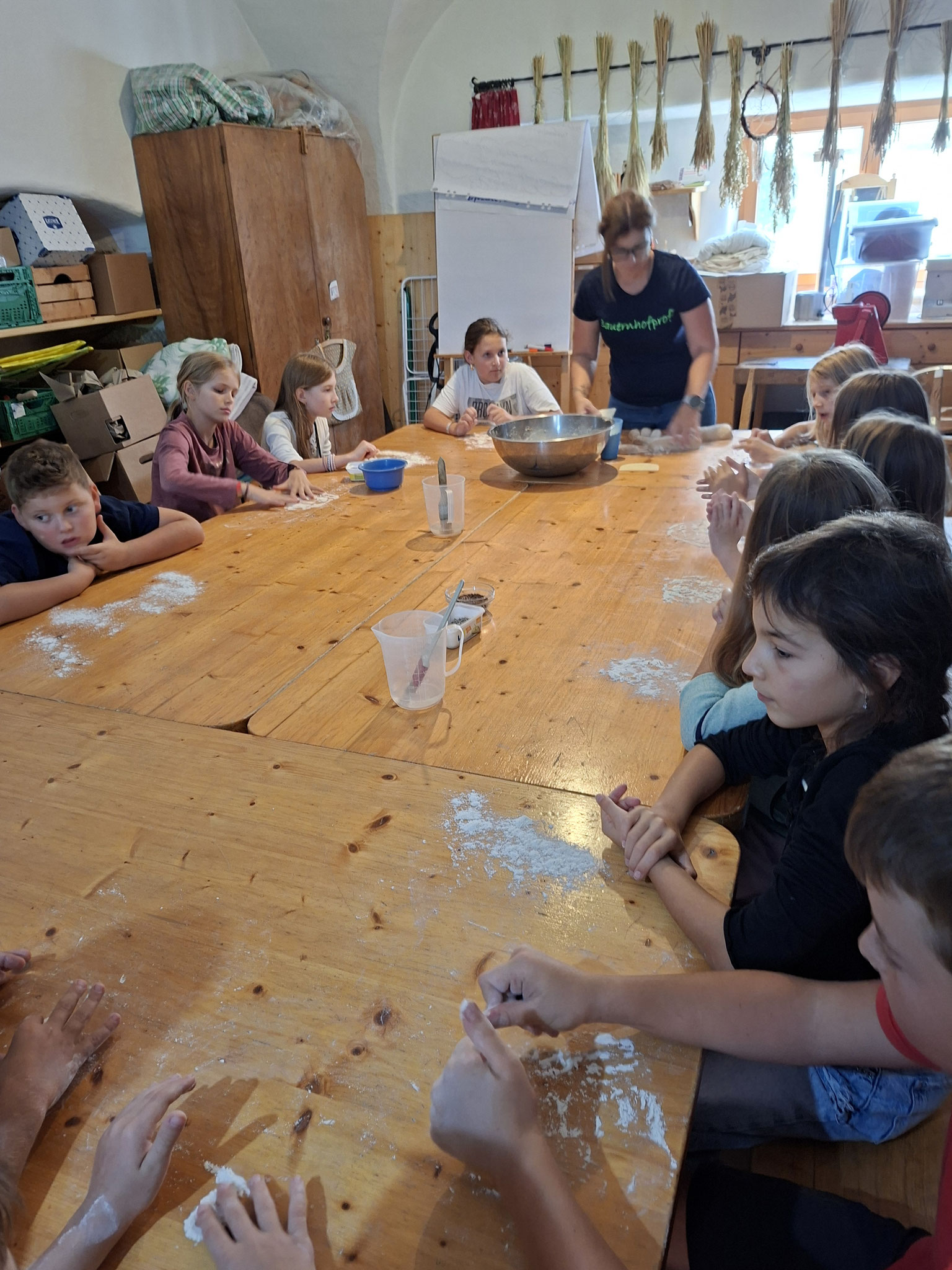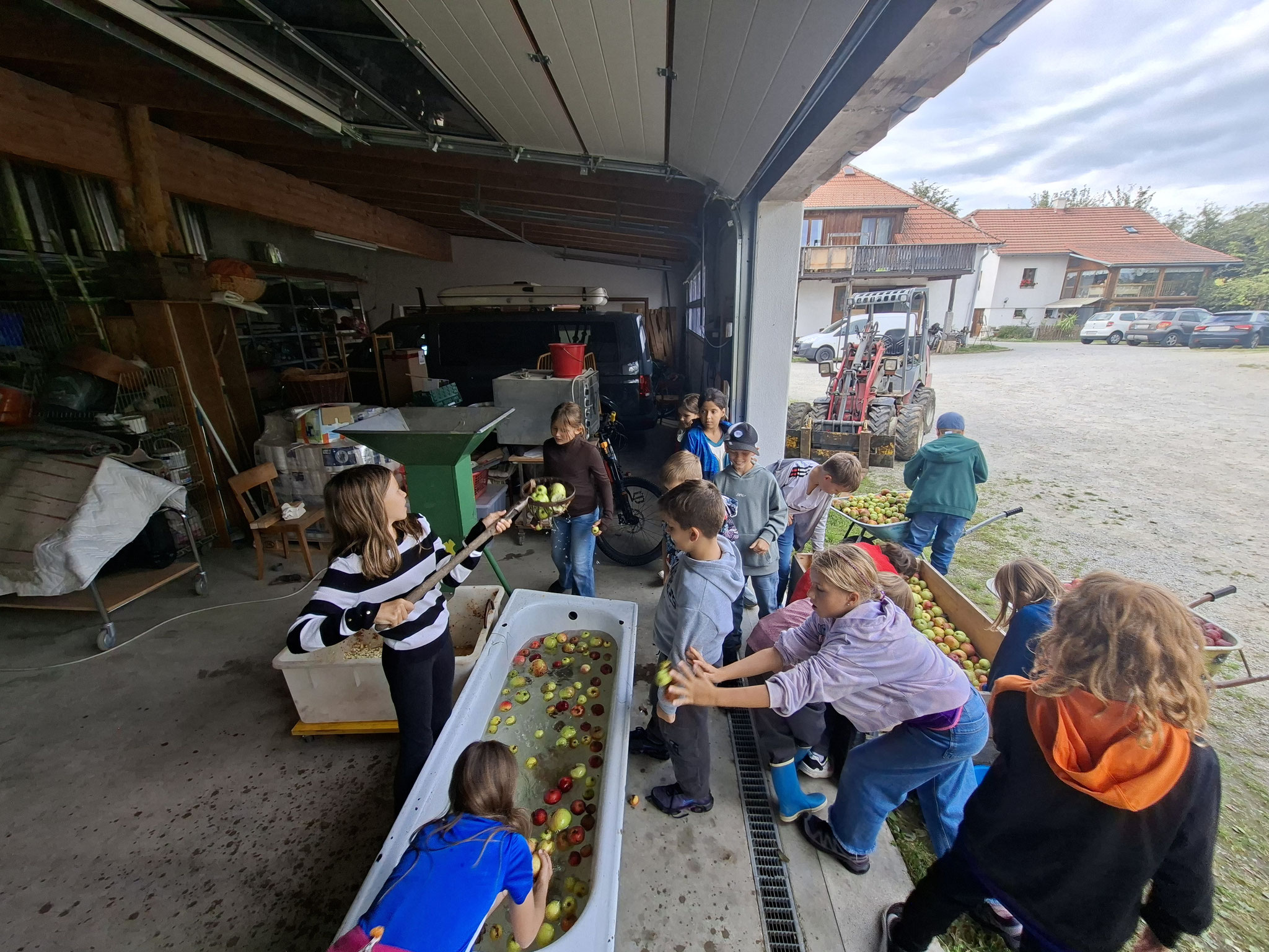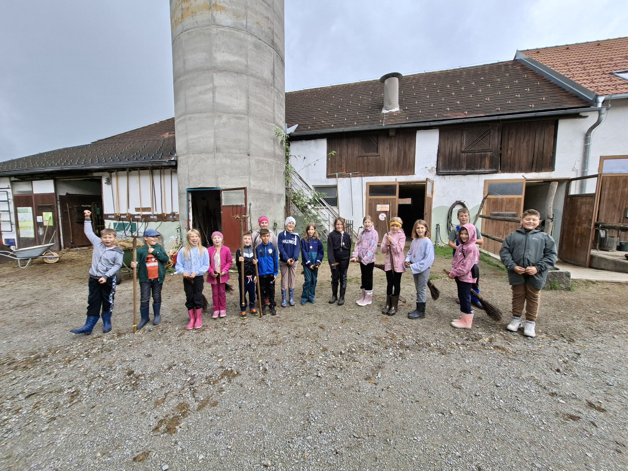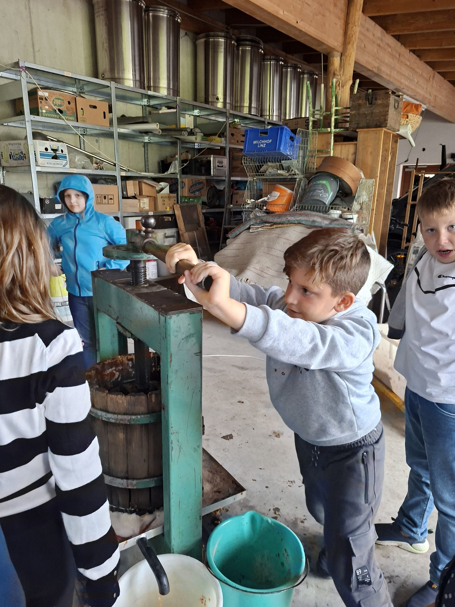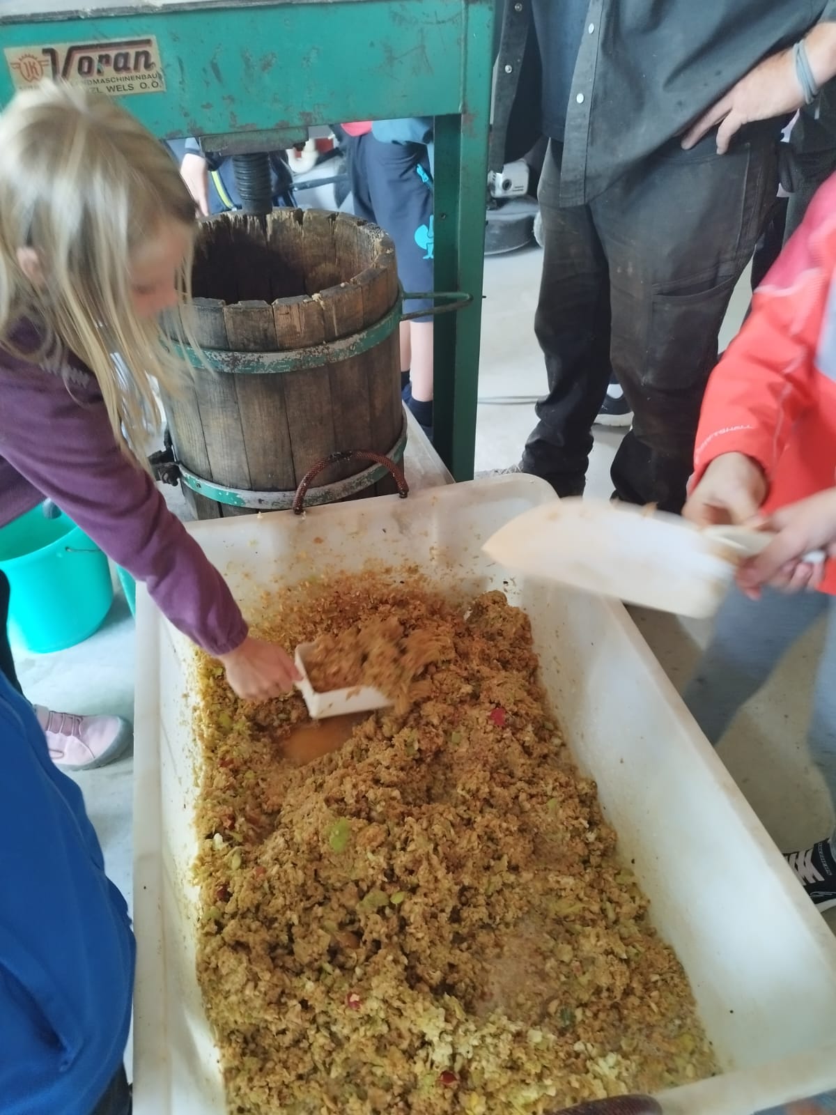 Die zweite Schulwoche verbrachten die 4A und 4B auf einem Bio-Bauernhof in Bad Zell. Dort lernten die Kinder das Leben und Arbeiten am Bauernhof hautnah kennen – vom Stallausmisten und Füttern der Tiere bis zum Brotbacken, Buttermachen und Apfelsaftpressen.
