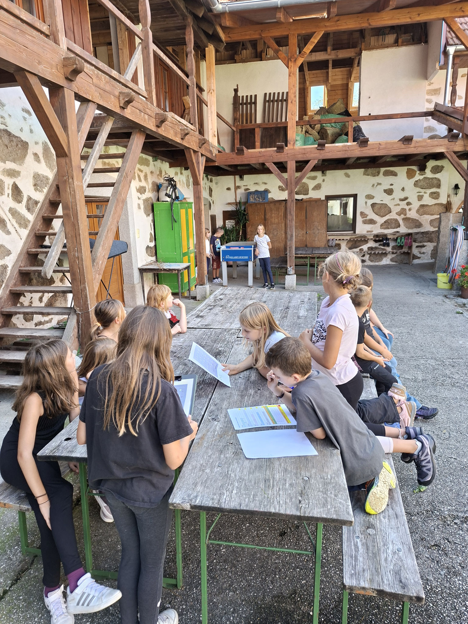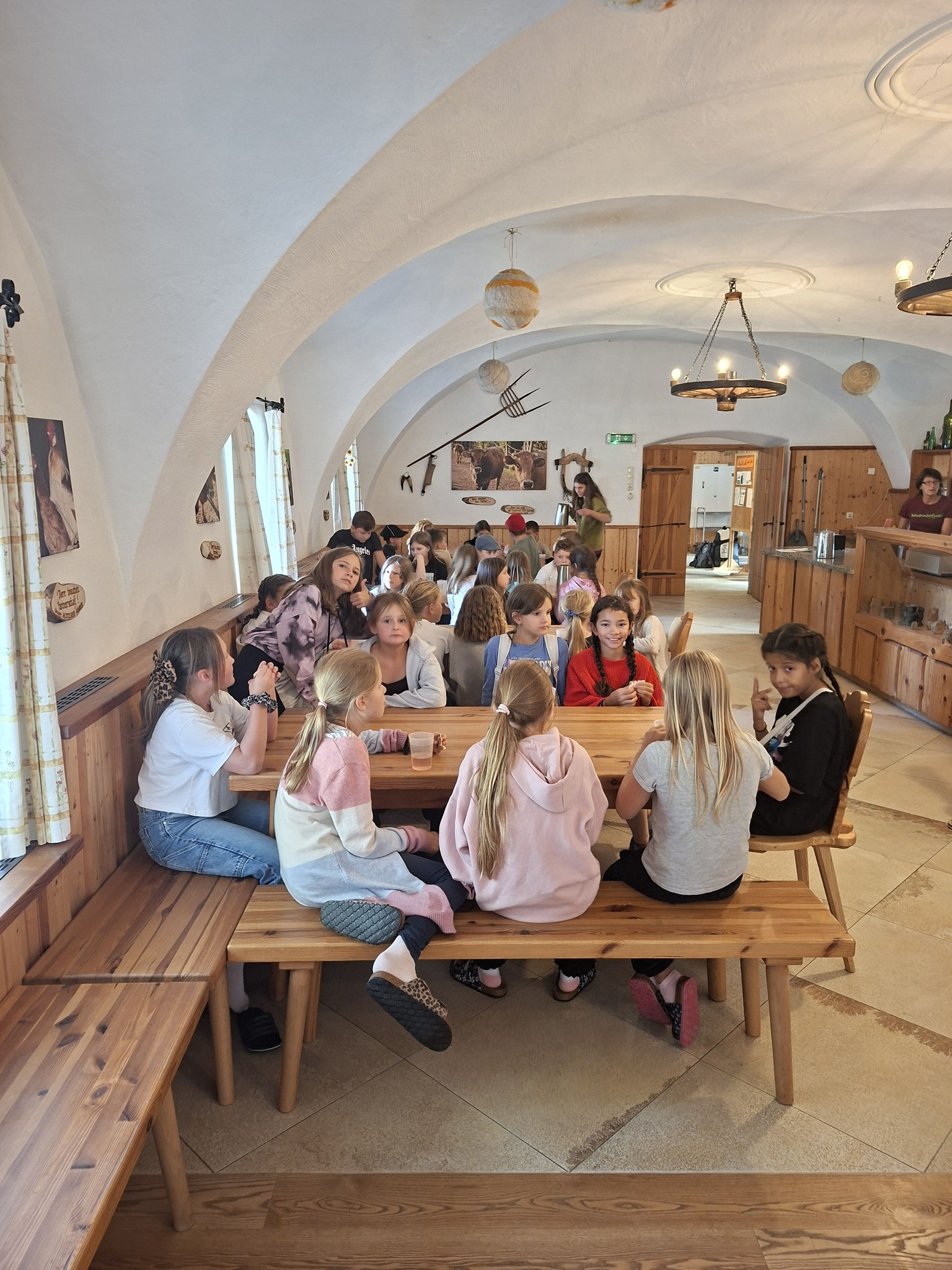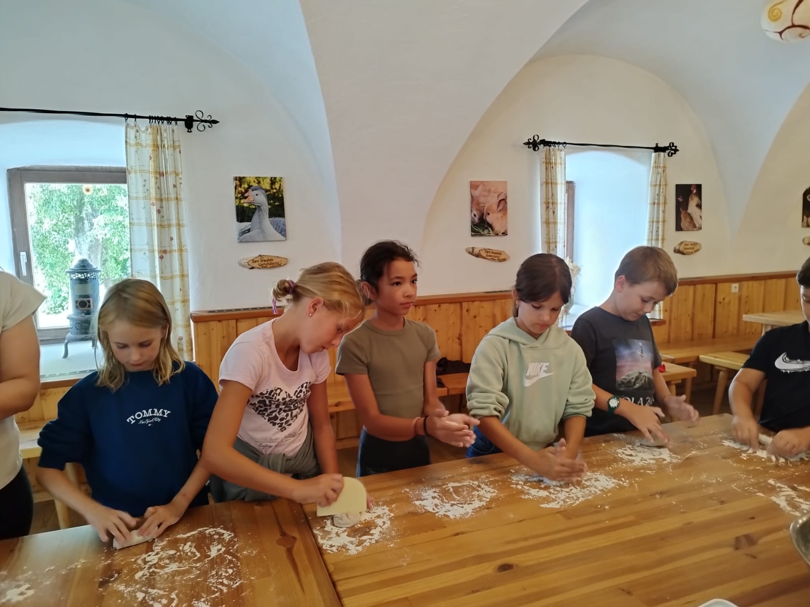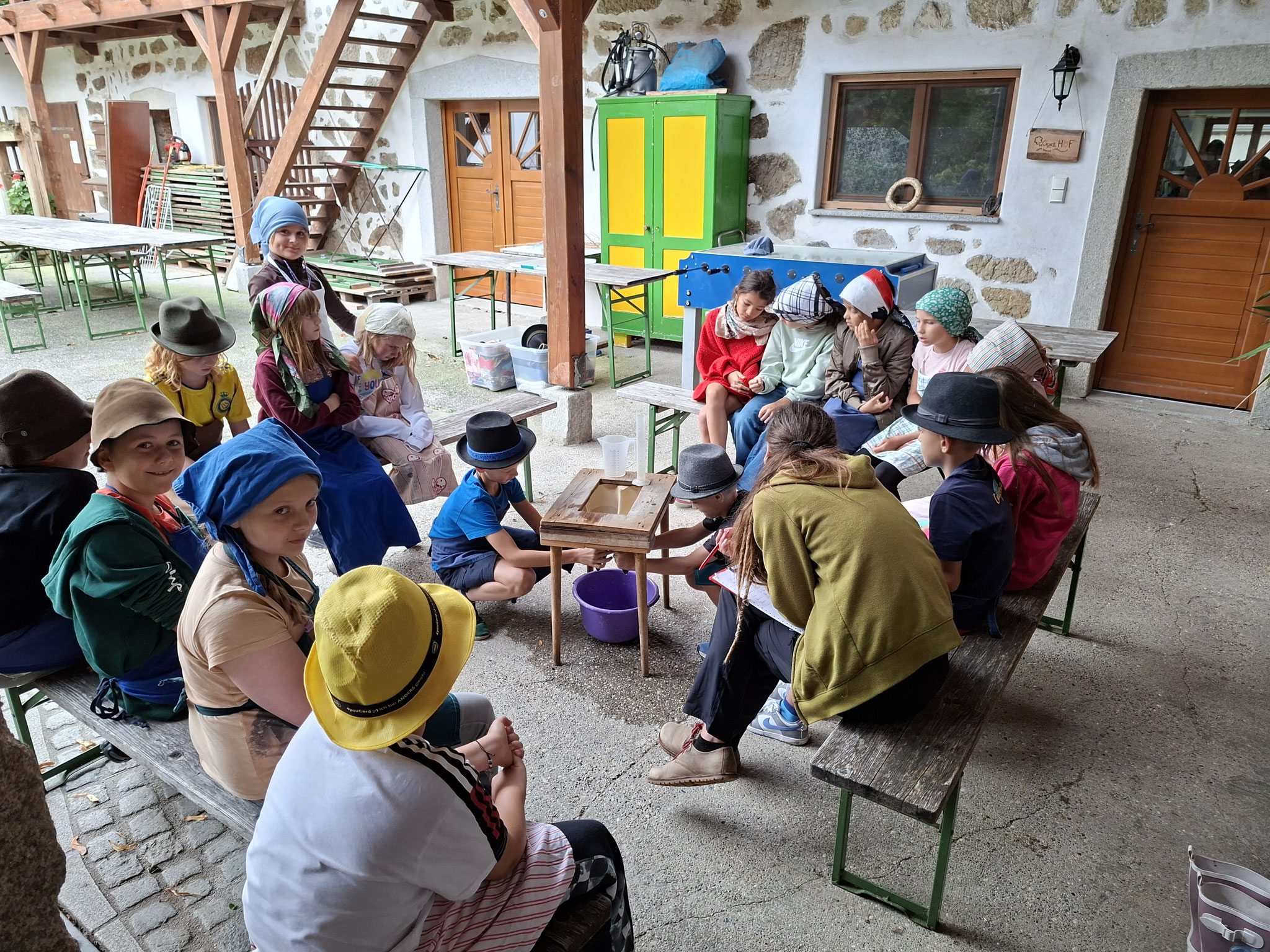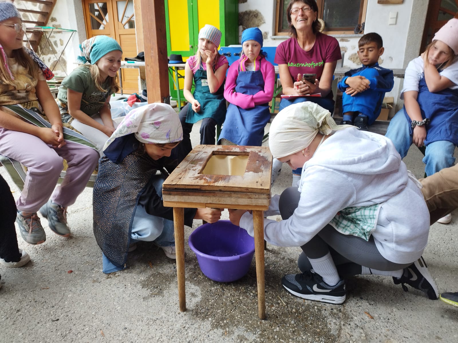 Die zweite Schulwoche verbrachten die 4A und 4B auf einem Bio-Bauernhof in Bad Zell. Dort lernten die Kinder das Leben und Arbeiten am Bauernhof hautnah kennen – vom Stallausmisten und Füttern der Tiere bis zum Brotbacken, Buttermachen und Apfelsaftpressen.