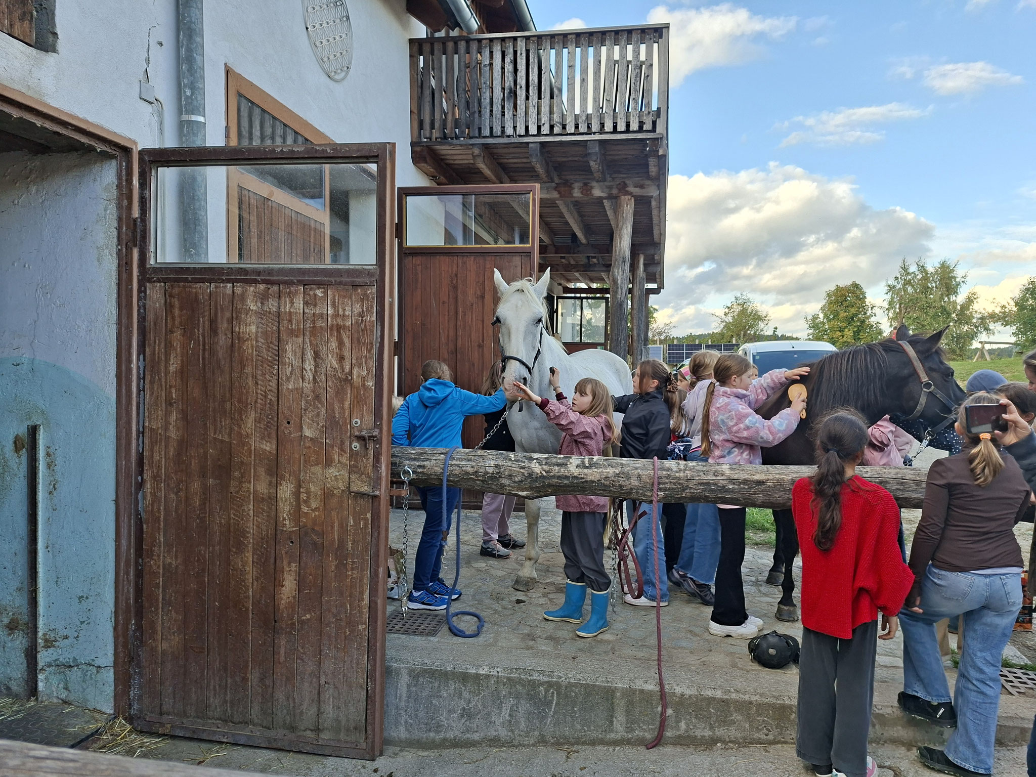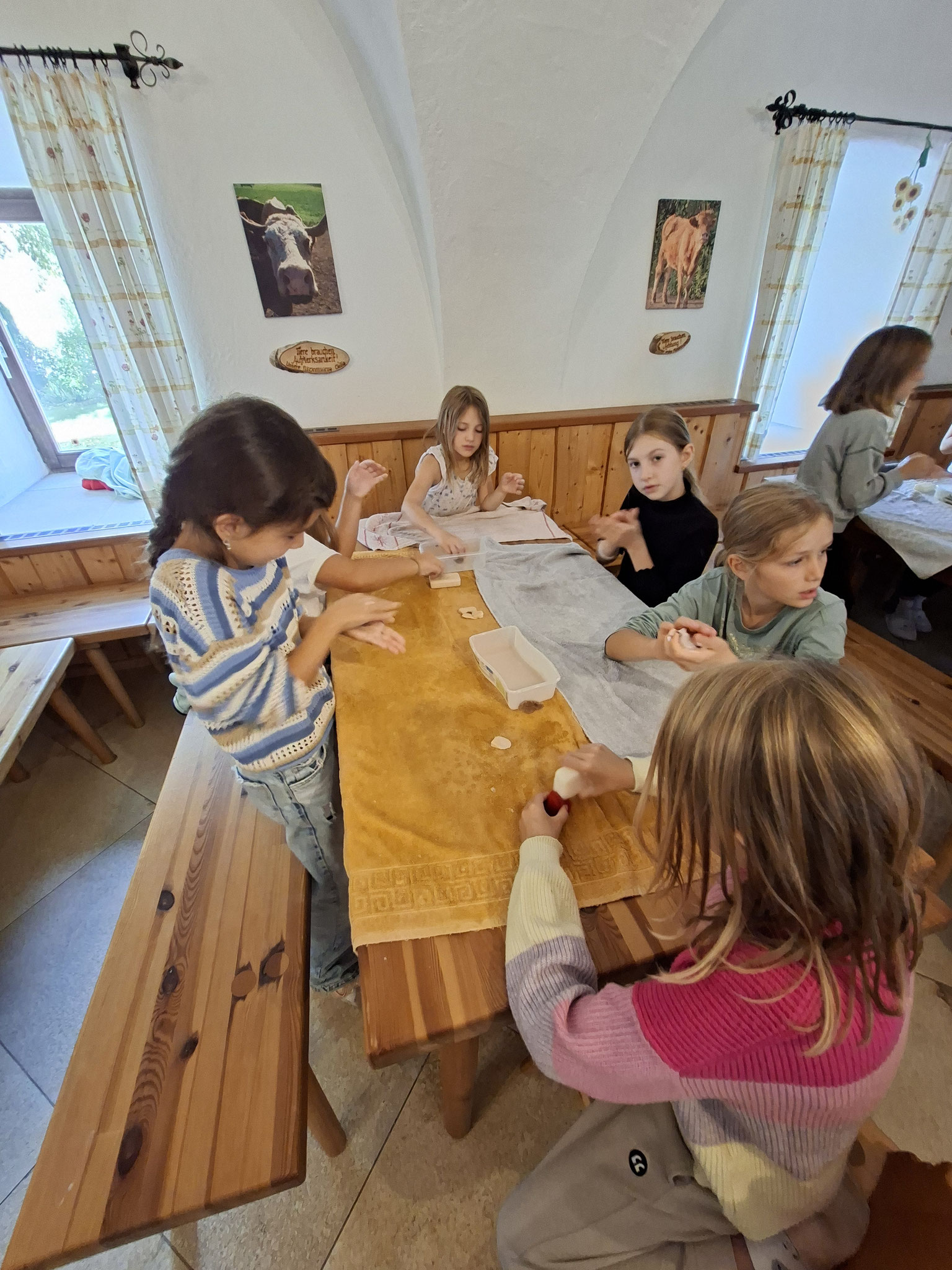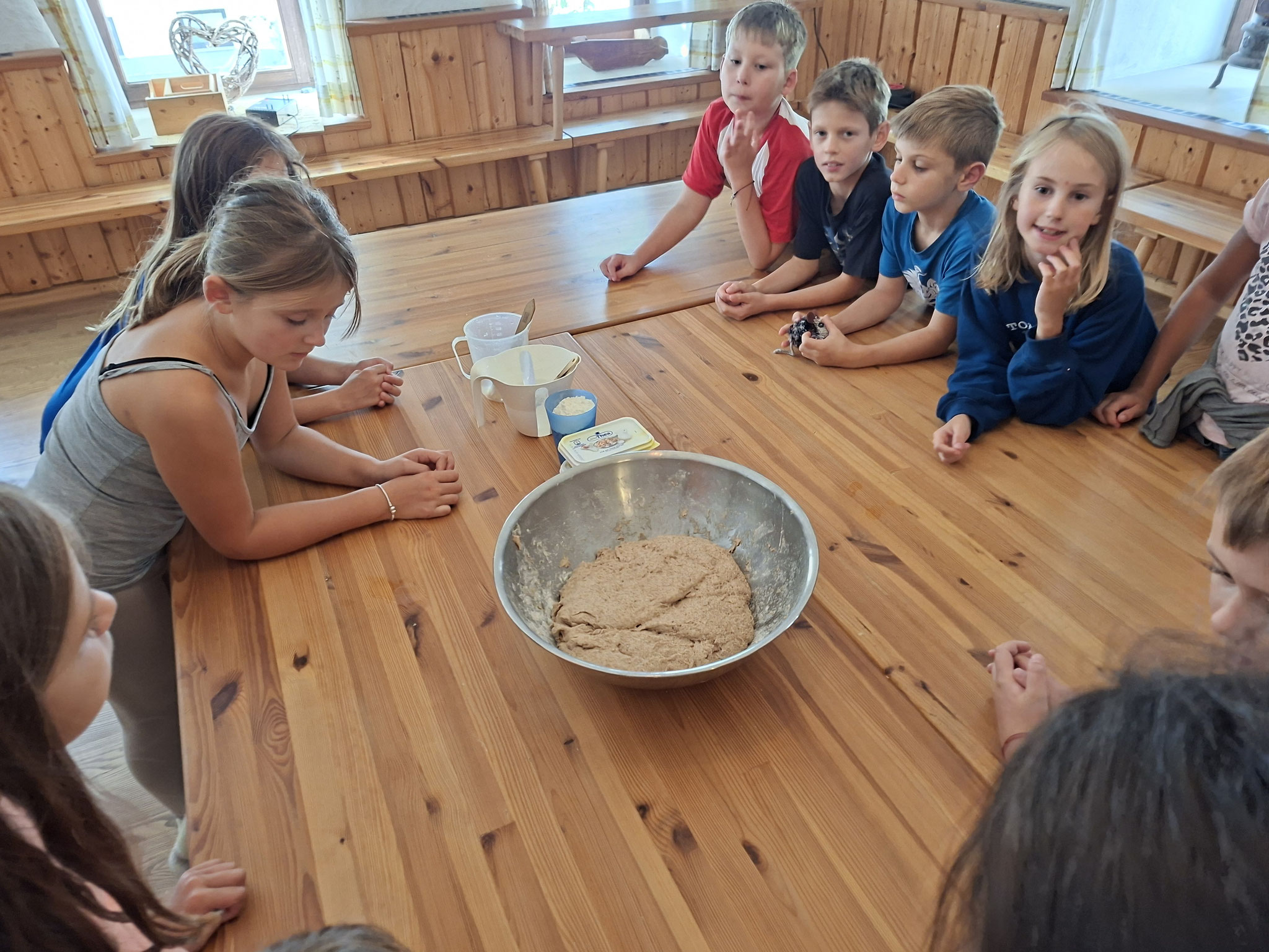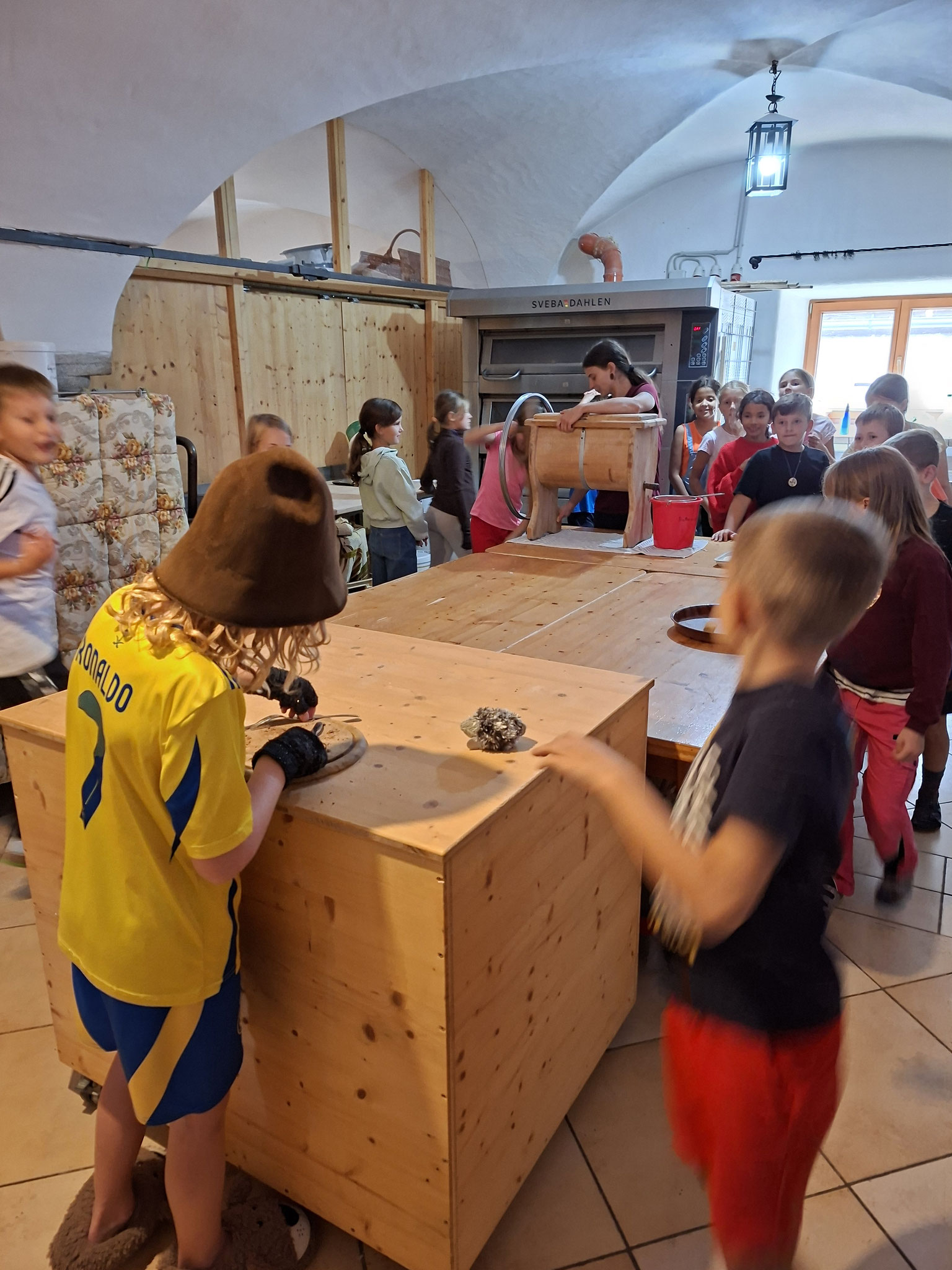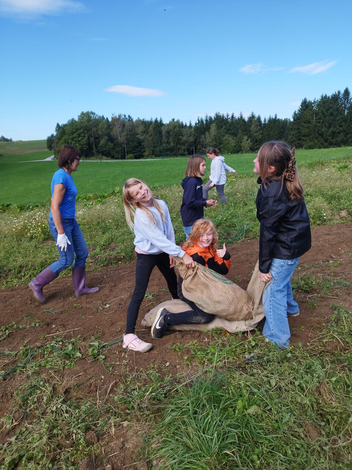 Die zweite Schulwoche verbrachten die 4A und 4B auf einem Bio-Bauernhof in Bad Zell. Dort lernten die Kinder das Leben und Arbeiten am Bauernhof hautnah kennen – vom Stallausmisten und Füttern der Tiere bis zum Brotbacken, Buttermachen und Apfelsaftpressen.