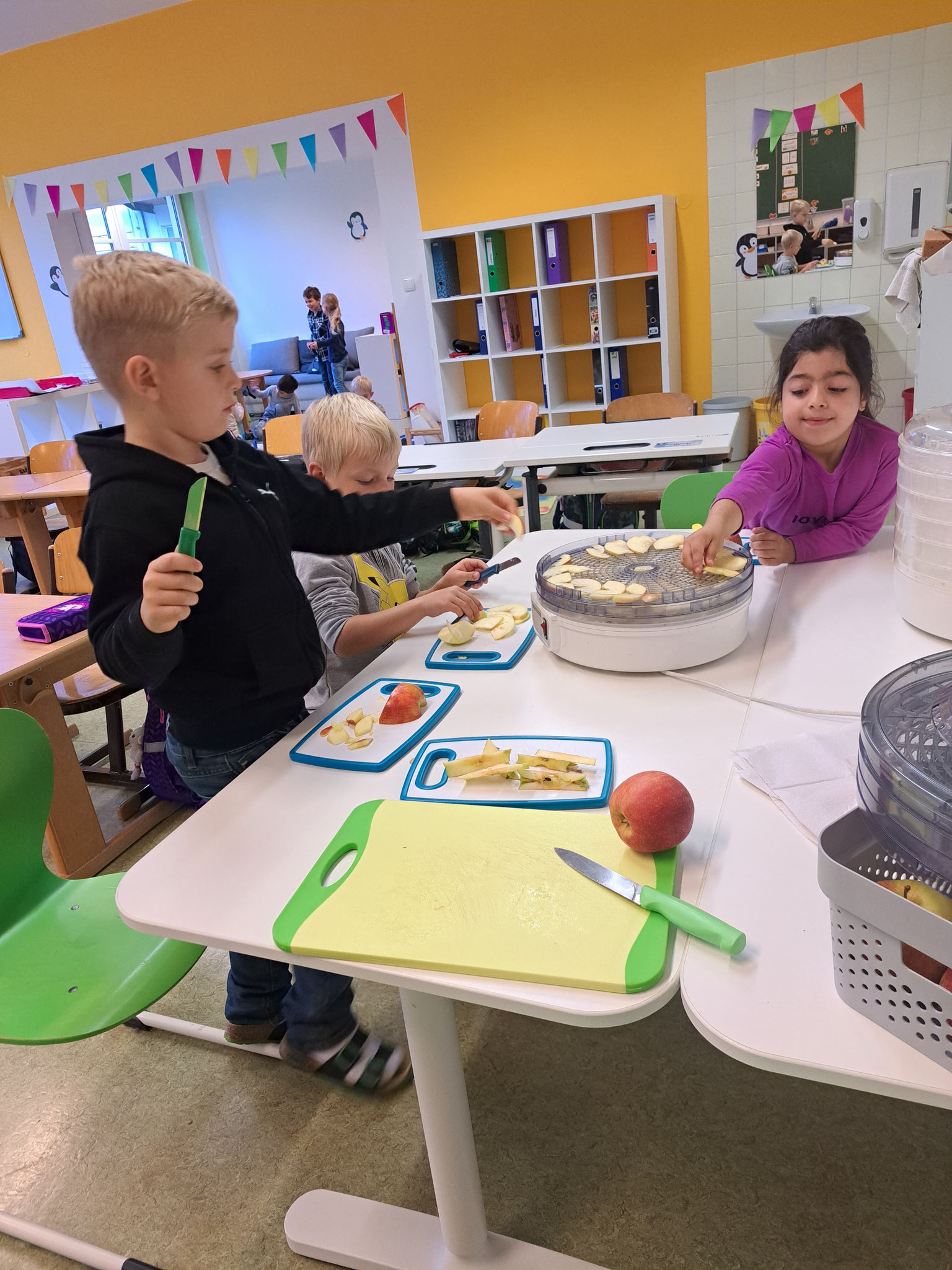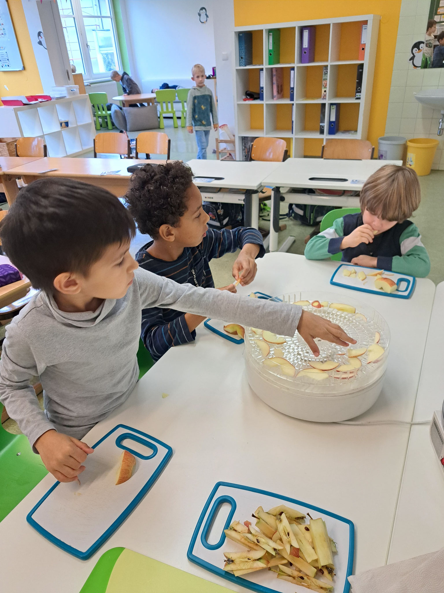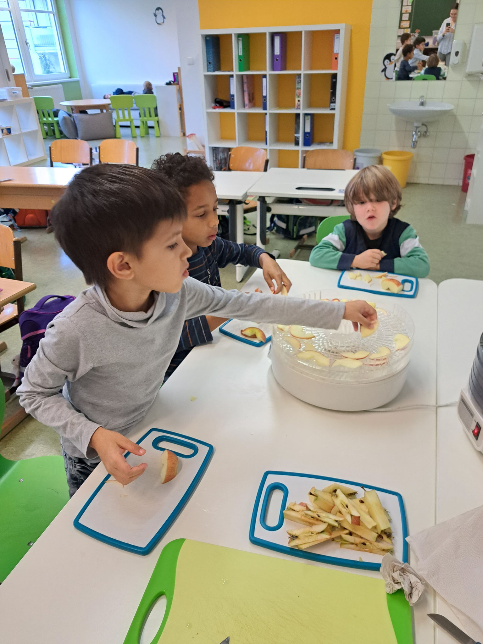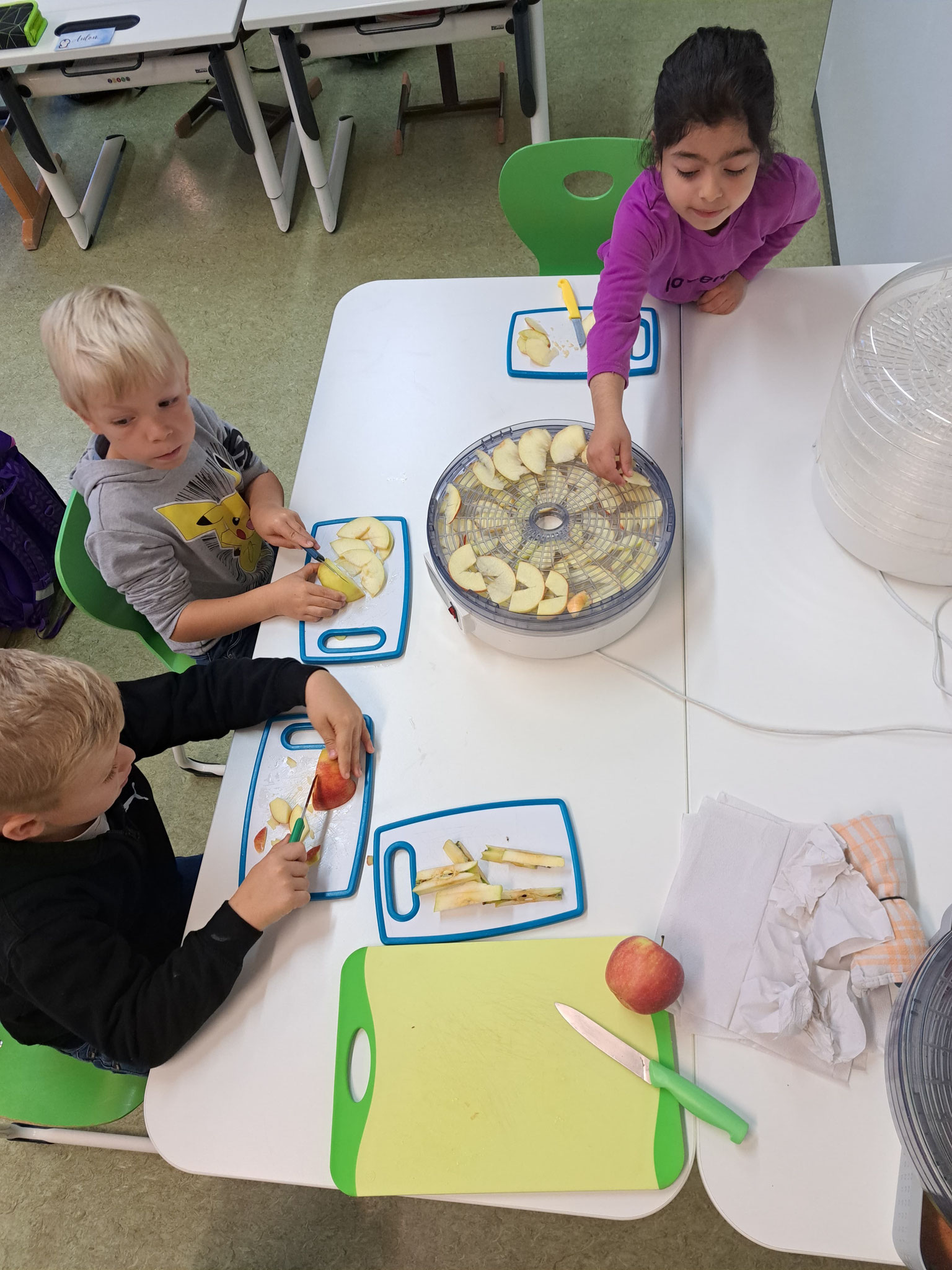 Wir machten Apfelchips! Alle helfen fleißig mit und waschen, schneiden und trocknen die Äpfel. Der Duft war himmlisch und das Verkosten war kaum abzuwarten. Das gemeinsame Essen unserer Chips am nächsten Tag war ganz besonders toll!