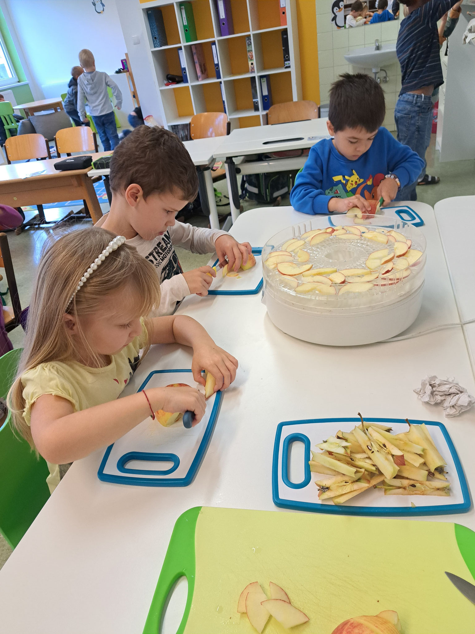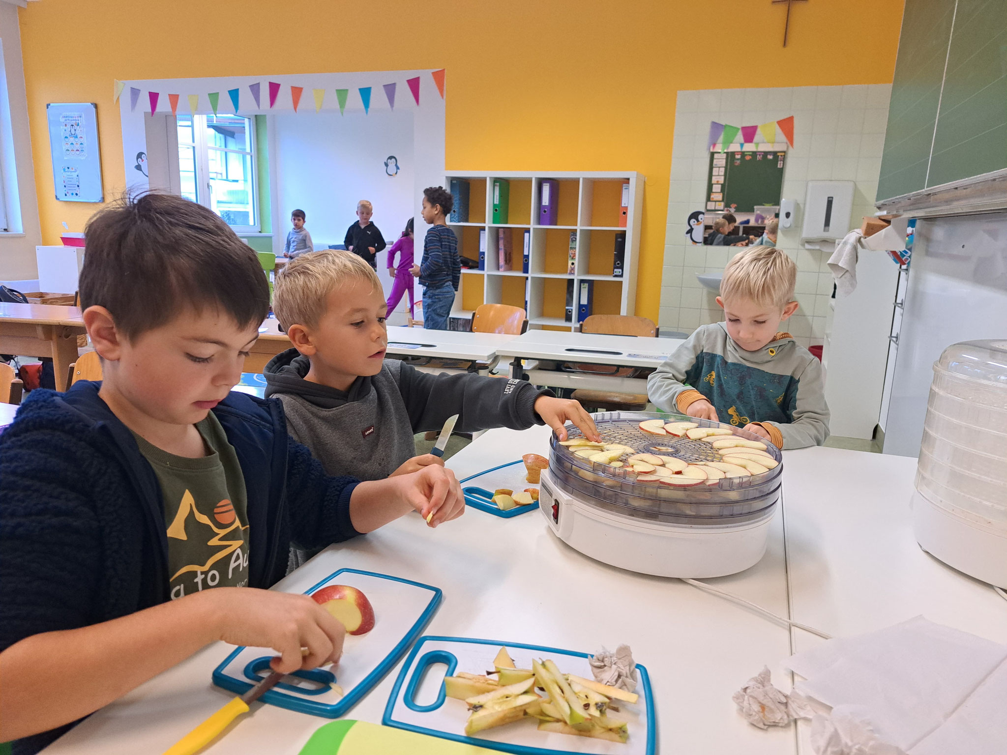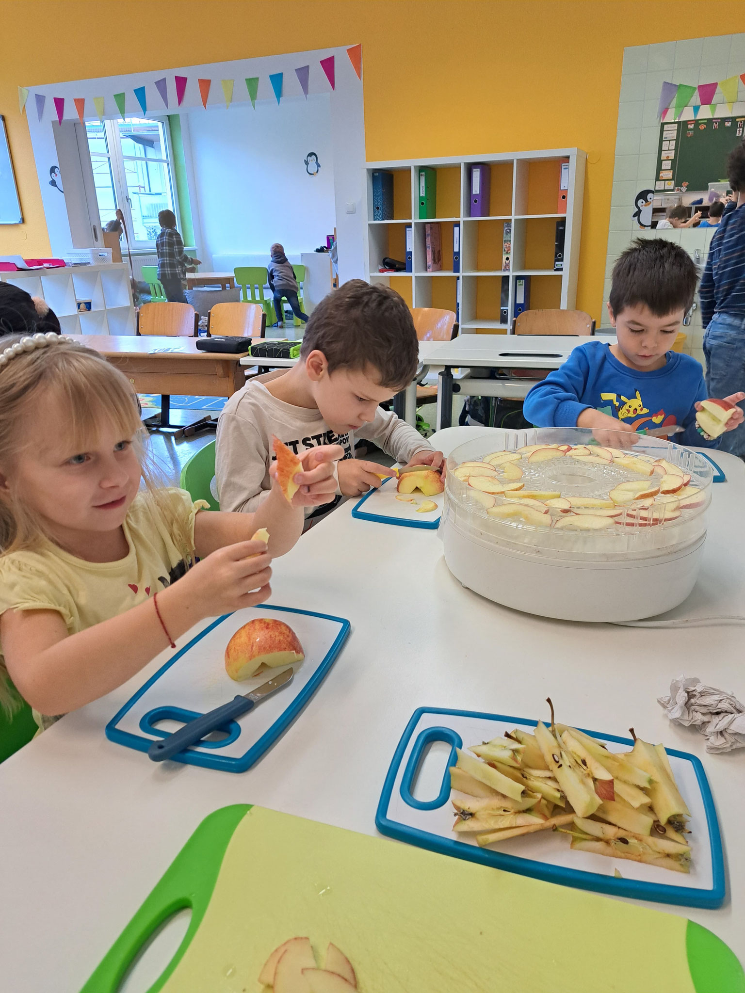 Wir machten Apfelchips! Alle helfen fleißig mit und waschen, schneiden und trocknen die Äpfel. Der Duft war himmlisch und das Verkosten war kaum abzuwarten. Das gemeinsame Essen unserer Chips am nächsten Tag war ganz besonders toll!