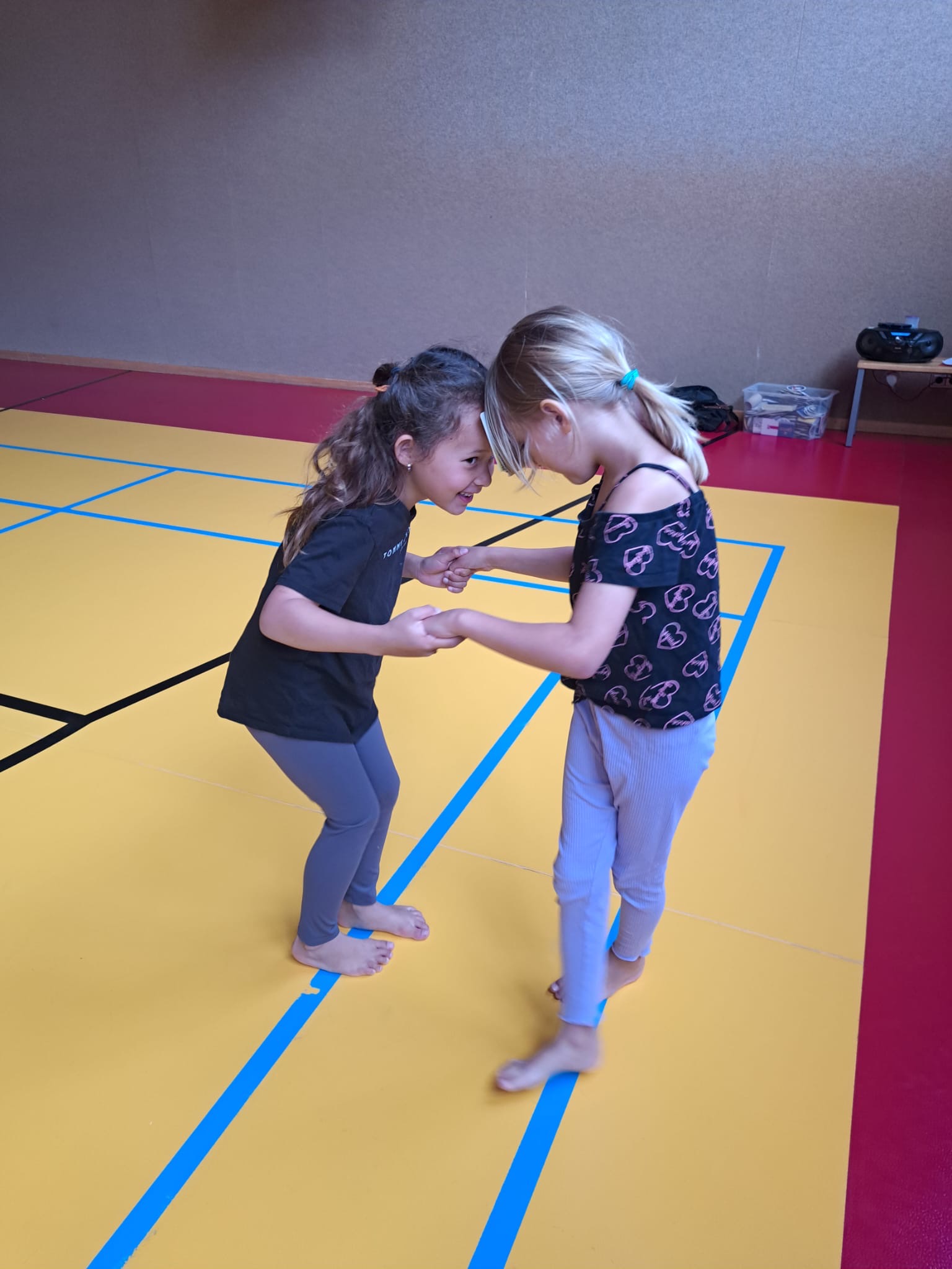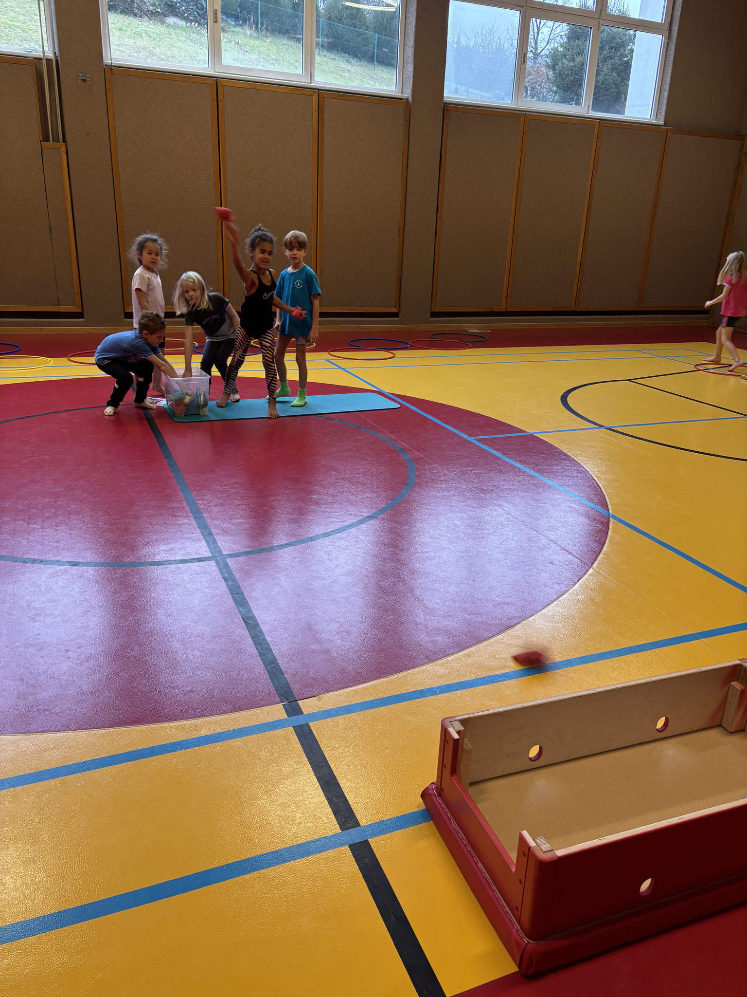 Gemeinsam mit der 1C absolvierten wir einige Weihnachtsstationen im Turnsaal: Kamin klettern, Geschenke-Zielwurf, Schneespuren hüpfen, von Kamin zu Kamin hüpfen